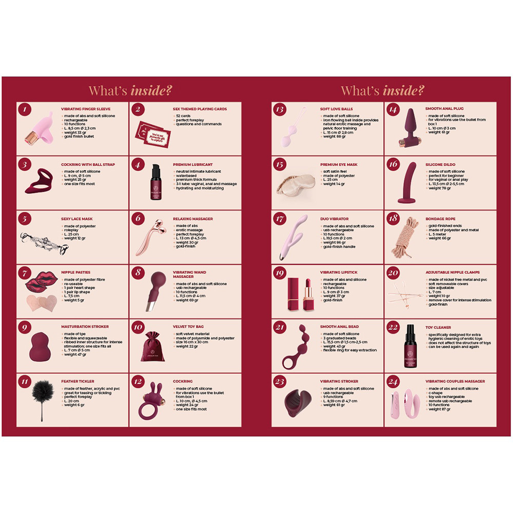 Ez a különleges adventi naptár minden napra tartogat egy új meglepetést. A gondosan válogatott szexjátékok és kiegészítők változatos élményeket nyújtanak – a játékosabbtól a szenvedélyesebbig.