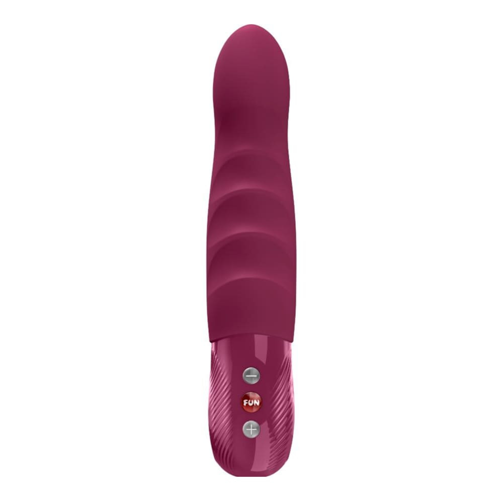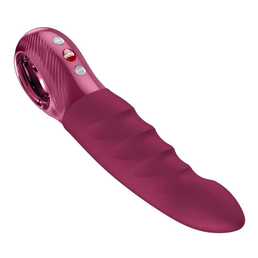 A készülékről A játékszert a merev vázon kellemes tapintású, vastag, puha, bordó szilikonborítás fedi. A fejrész kicsúcsosodik, finoman előrehajlik, a törzse az elülső oldalon bordázott, ami extra stimulációt biztosít. A markolata a törzséhez passzoló színű műanyag, a kezelőgombok ezen a markolaton kaptak helyet. A markolatban egy harmonizáló színű, üreges metálgyűrű kapott helyet, ami látványnak sem utolsó, de használat közben is praktikus lehet, segítve a kényelmes kézben tartást, főleg, hogy enyhén redőzött, ami síkosabb helyzetekben szintén növelheti a stabilitást.