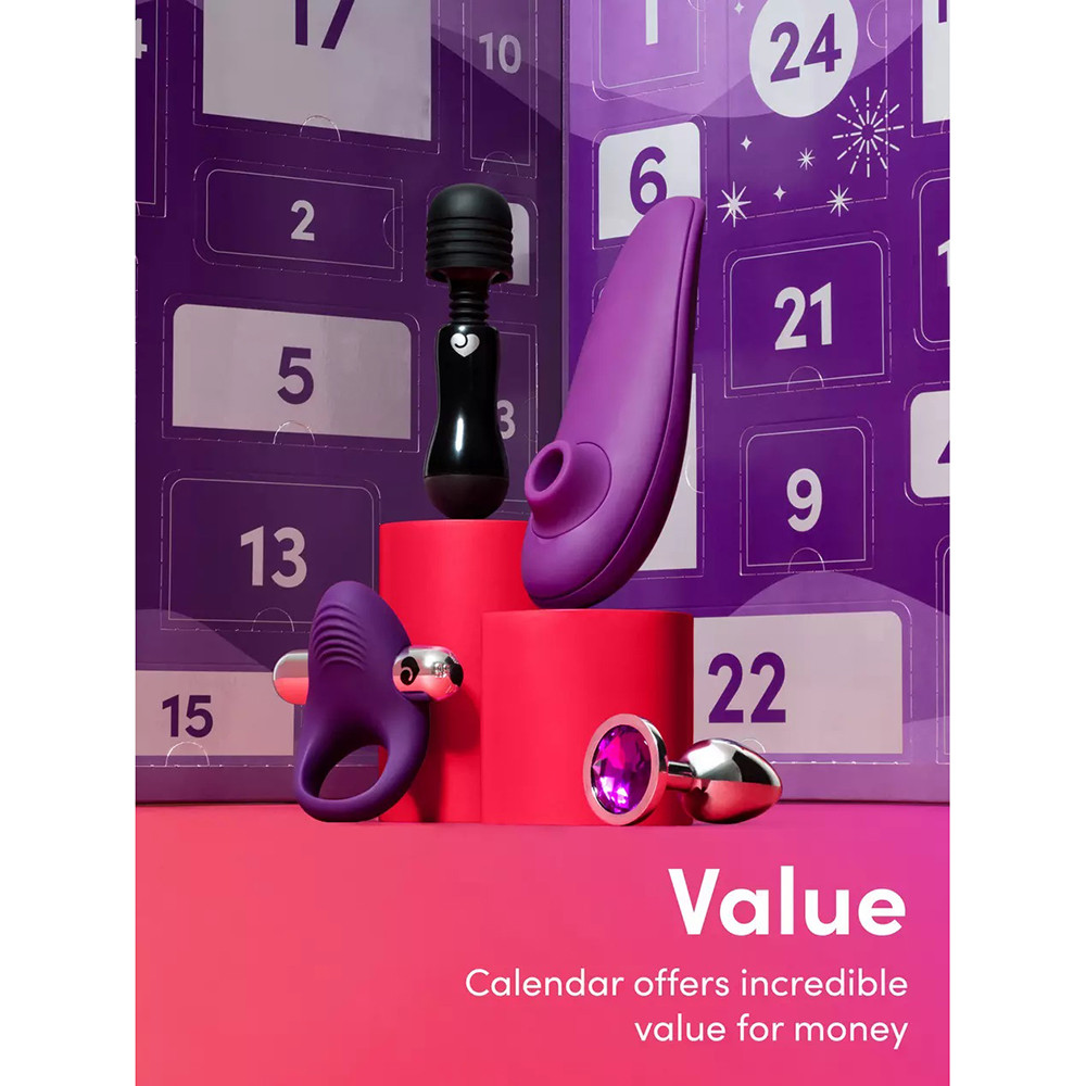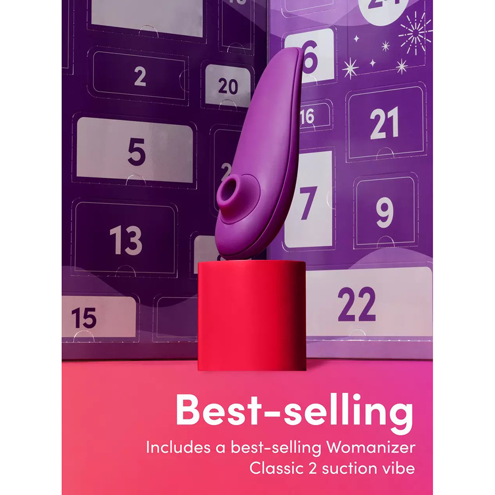 24 "fiókkal", azaz 24 meglepetést tartogató adventi naptár, "Womanizer Classic 2." léghullámos csiklóizgatóval.
